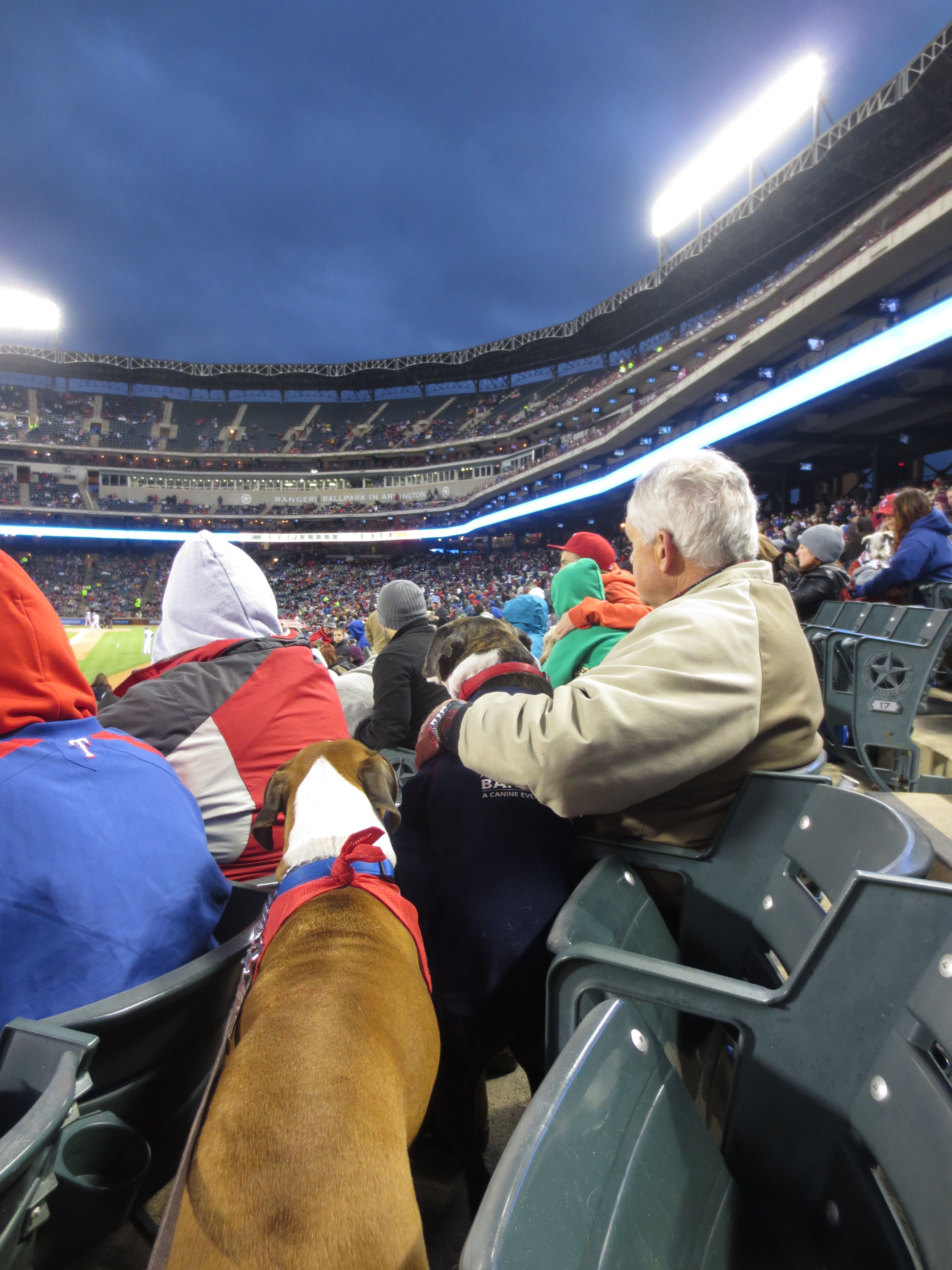 almost a letdown when neither dog did anything. And according to #Rangers Ballpark on Twitter, of the six hundred and eighty-nine dogs at Bark in the Park, only one soiled left field. Actually, we were already at our seats and it was a mixed lab that had slipped its collar and must have felt that center field was a perfect place to relieve itself. Within moments, several pooper scoopers and the mortified owner surrounded the dog. Needless to say, it was a Kodak moment for the Jumbotron as well as my camera!