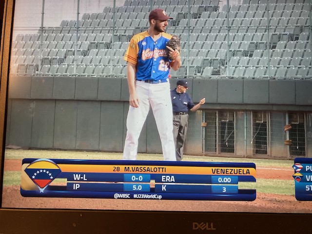 The tournament was in Taiwan. There was a twelve-hour difference in time and they were a day ahead of us. I found myself up at 3AM in my jammies and sipping green tea while watching his games. Michele was awesome. He pitched relief in three games shutting down the batters from top ranked Japan and Chinese Taipei as well as Puerto Rico. Although the Venezuelan team fell short in tournament play, Vassalotti did not disappoint with a 0.00 ERA, giving up only 2 hits and 4 walks. He stuck out 4. According to the game announcers, there was speculation that Japan and Chinese Taipei might be thinking of pursuing the right-hander to pitch for their countries!!