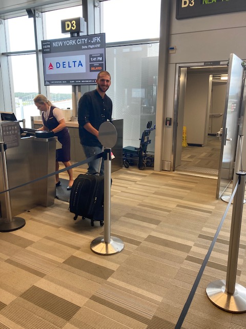 While waiting in the gatehouse for boarding, we heard the agent announce about the flight being near full to JFK and the need to gate-check large roller bags at no extra charge. I looked at Michele’s which looked like it was ready to give birth and suggested taking his up to the podium. “Oh, it will fit,” he stated. I laughed to myself and thought of how many times I had heard that when I was a flight attendant. As predicted during boarding, the gate agent tagged his bag. He looked back at me. “It will be in the jetway at JFK. Trust me,” I assured him. “Now, don’t ring your flight attendant call button!” He laughed and headed down the jetway. A couple of hours later, I received a text. “I have arrived in New York City. That’s the button you mentioned?” followed by laughing emojis. Next was a picture of the panel above his seat. The following day, he finally arrived in Caracas.