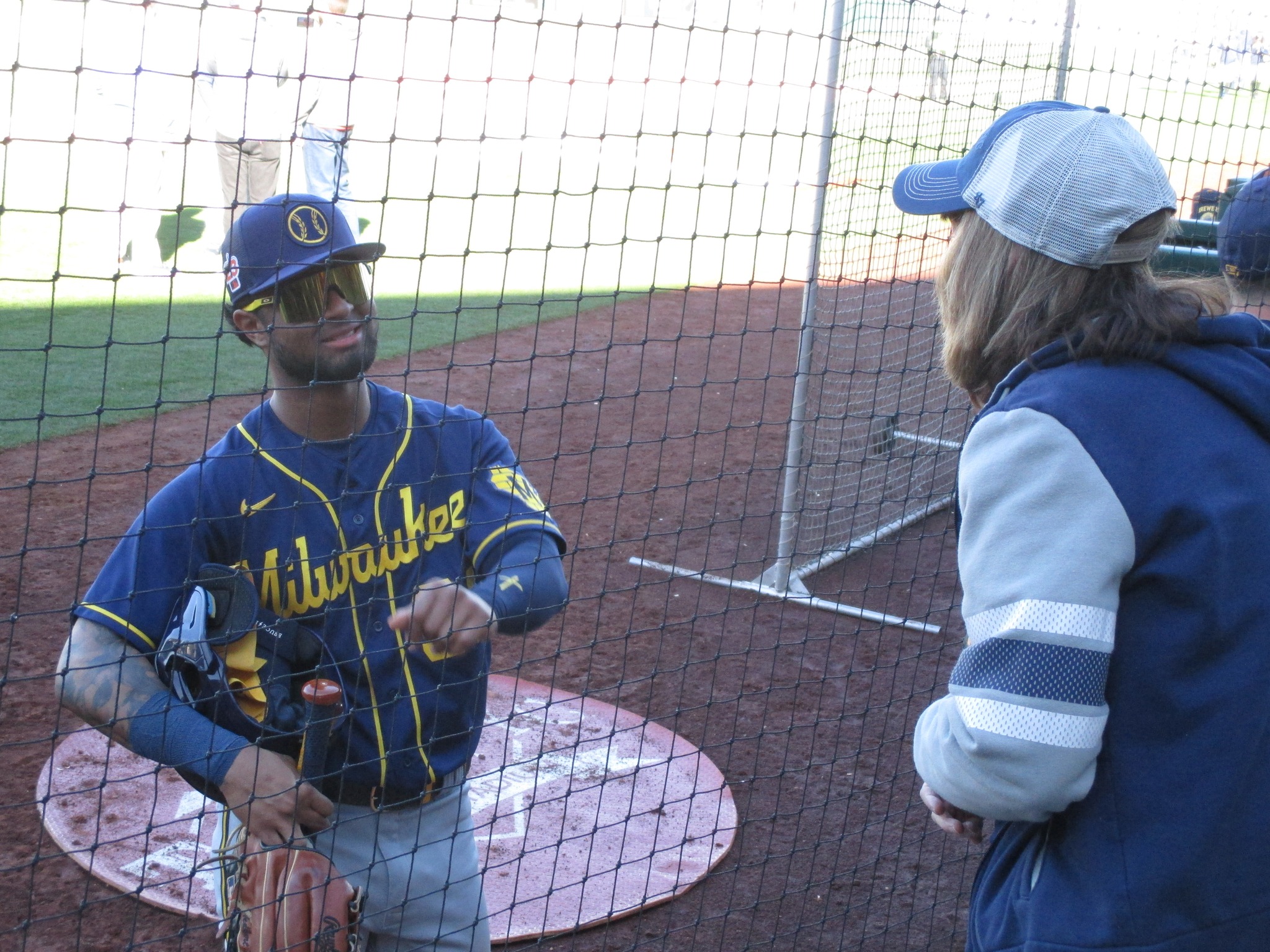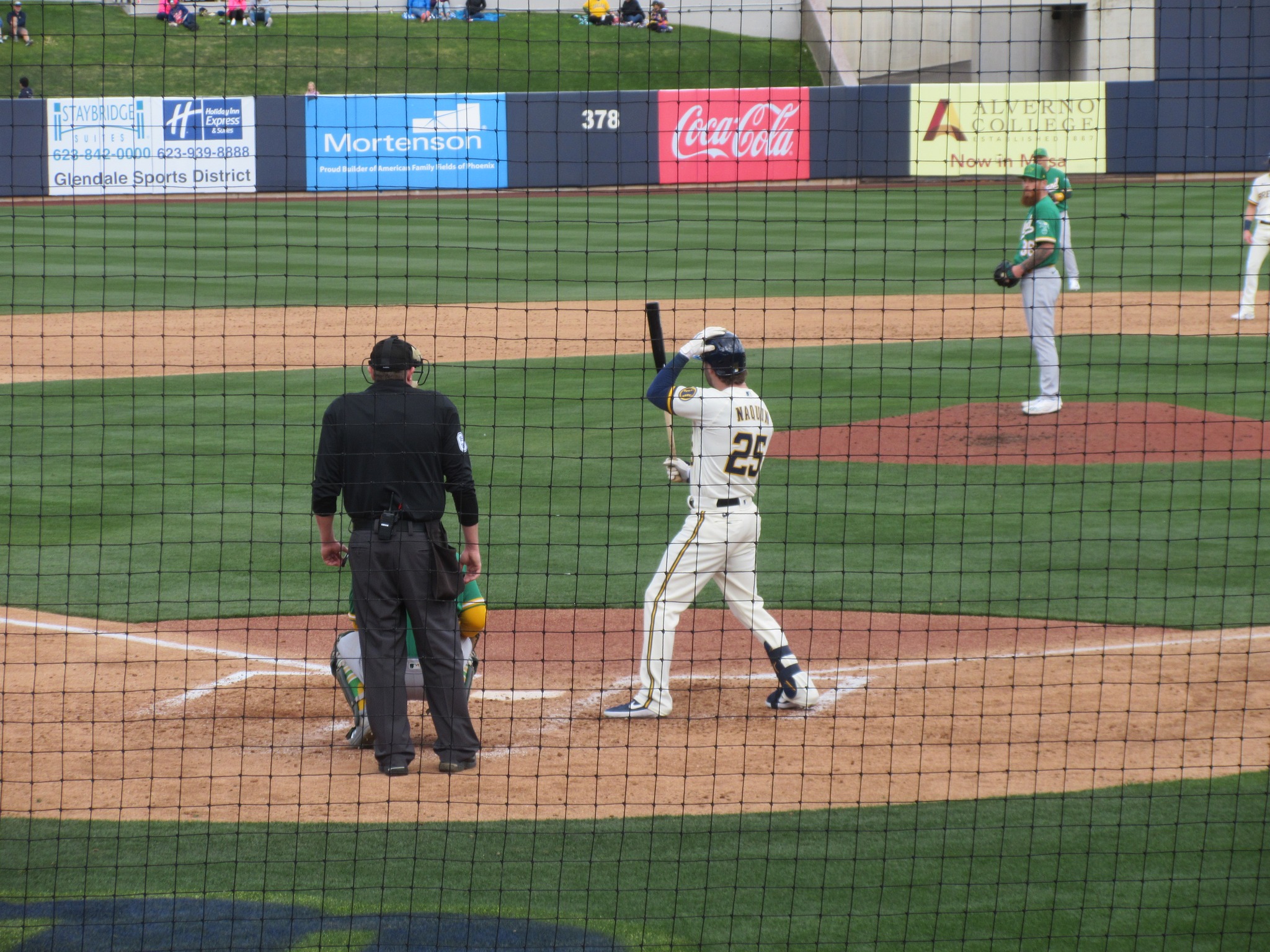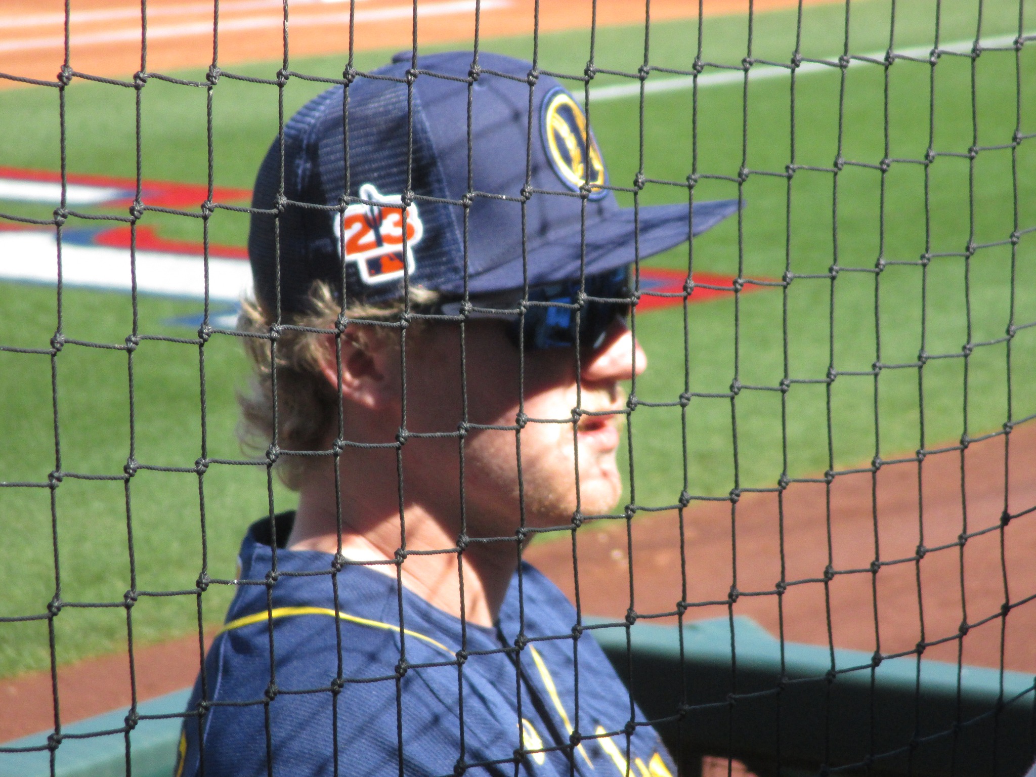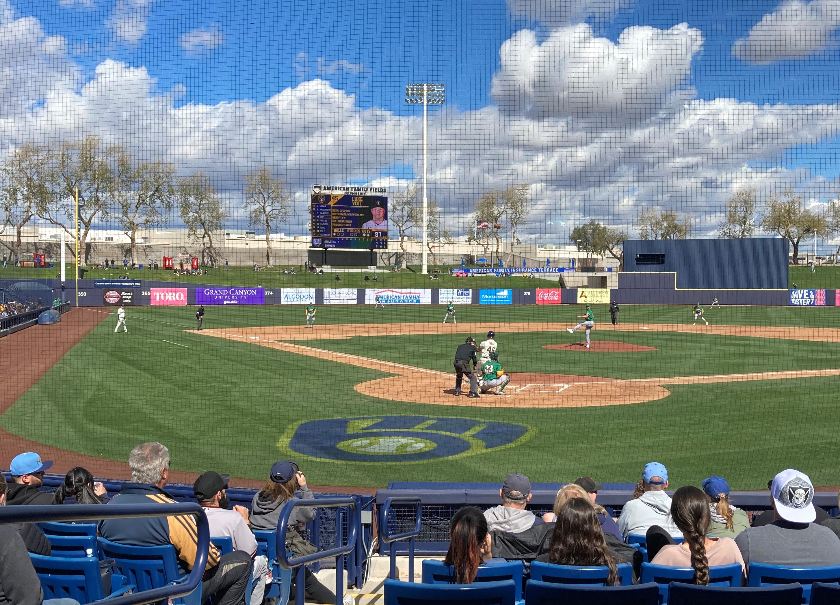 It was a return to Spring Training in March when the weather was supposed to be nicer. Minor leaguers were vying for promotions and most importantly, a celebration of our friend Michele Vassalotti’s performance in the World Baseball Classic was in the making. By taking a flight at oh-dark-thirty and thanks to gaining three hours on a time change, we were at the Brewers complex by mid-morning. Skies were very overcast and according to my weather app, rain was in the forecast. We peeked into the batting cages, then watched players at the practice fields stretching. We finally spotted a familiar frame briskly walking towards us. It was Vassalotti. “I’m pitching in the big field this morning! Come see me!” and off he sauntered. I looked at my watch. We were good for an hour and a half before we needed to head to Goodyear Park for the afternoon game. Within minutes, we were seated with scouts and some family members watching a closed scrimmage of the Brewers. After Michele’s successful inning, we left.