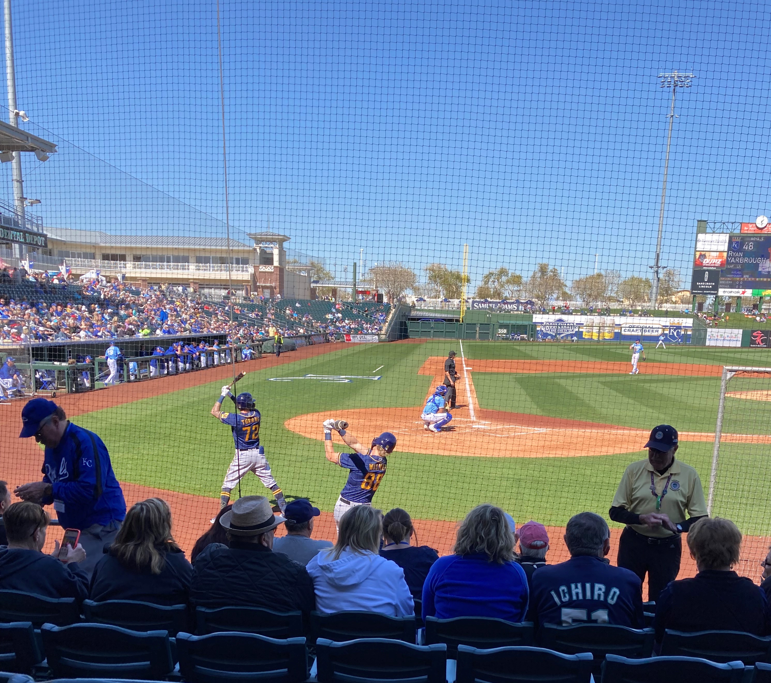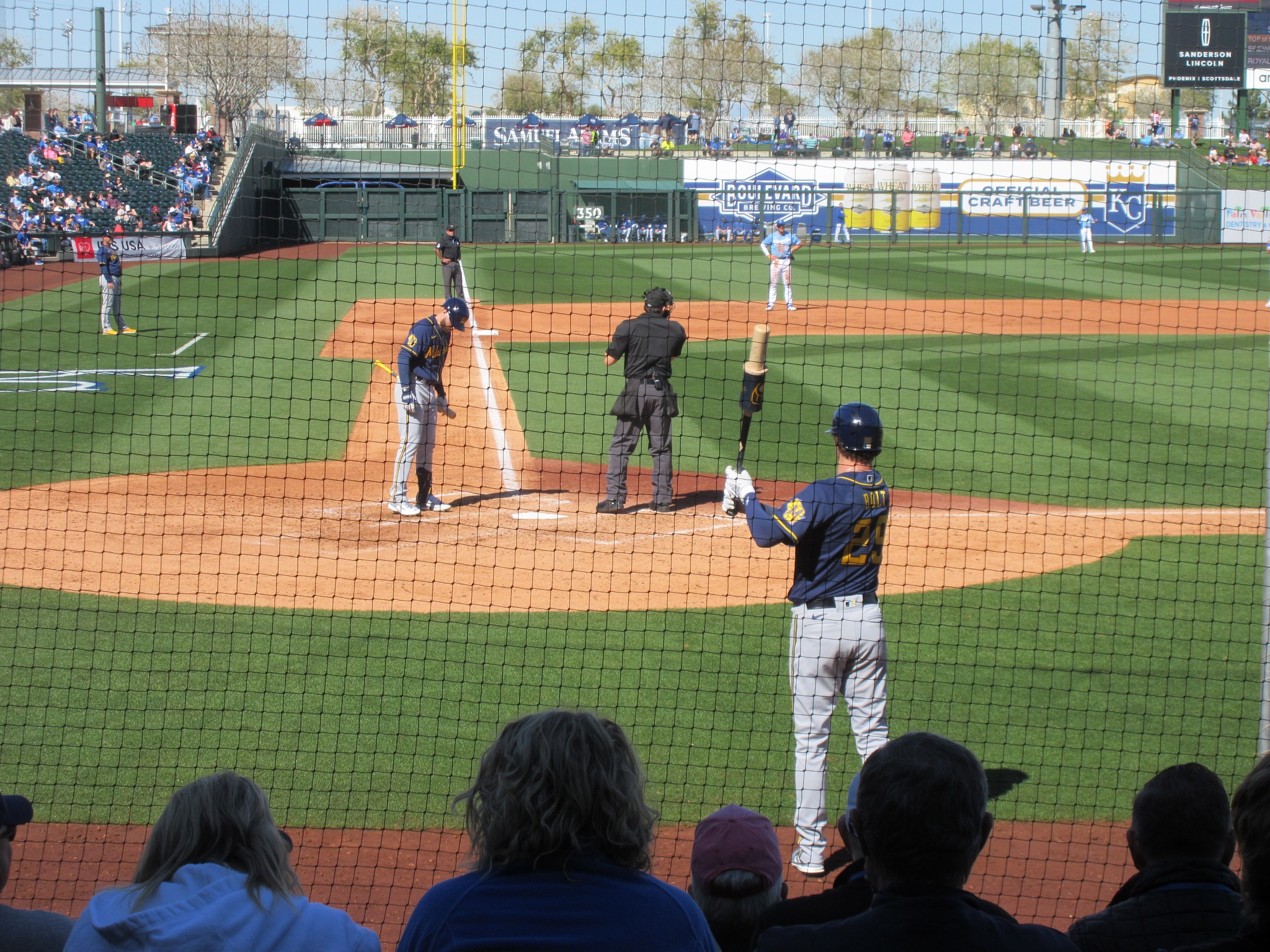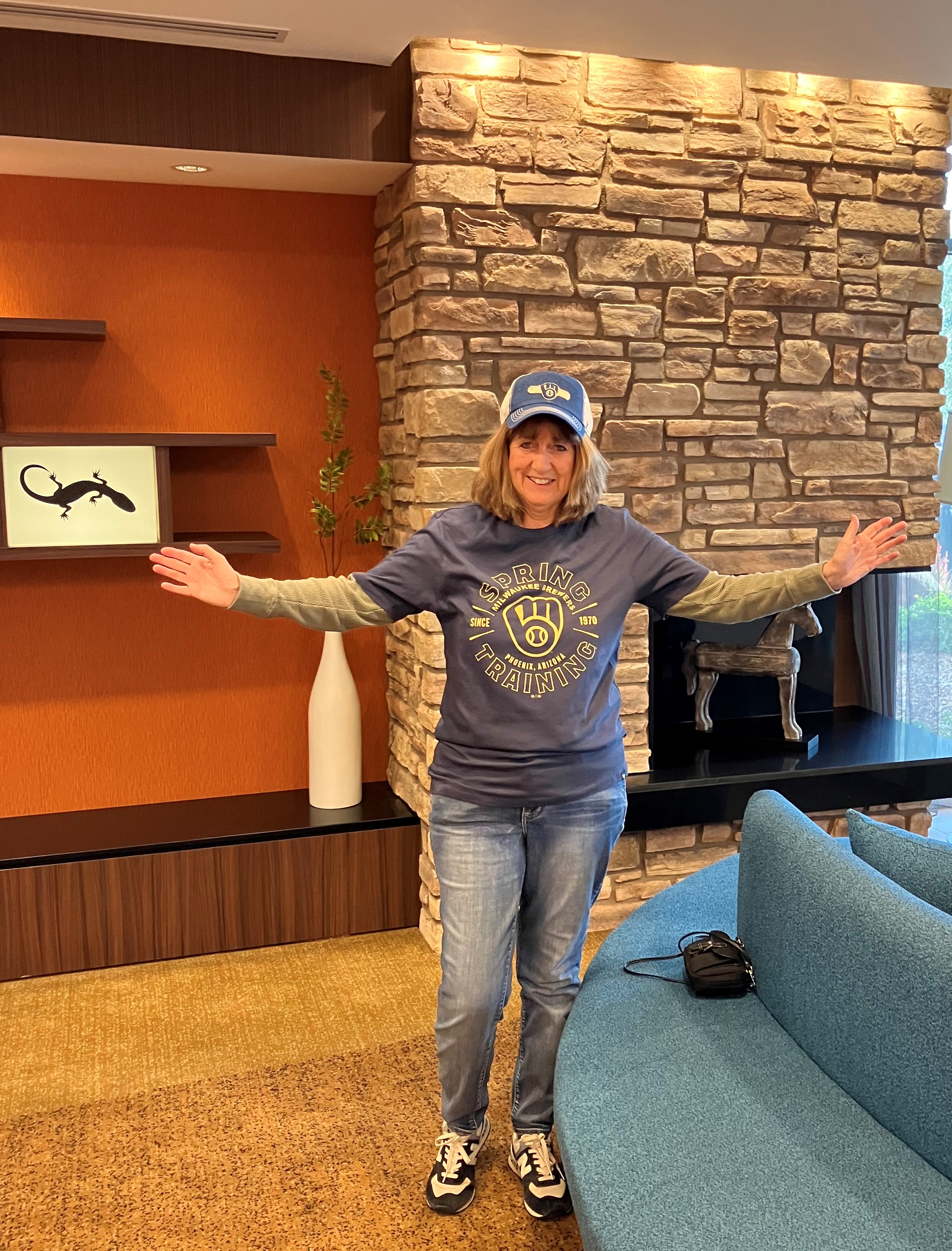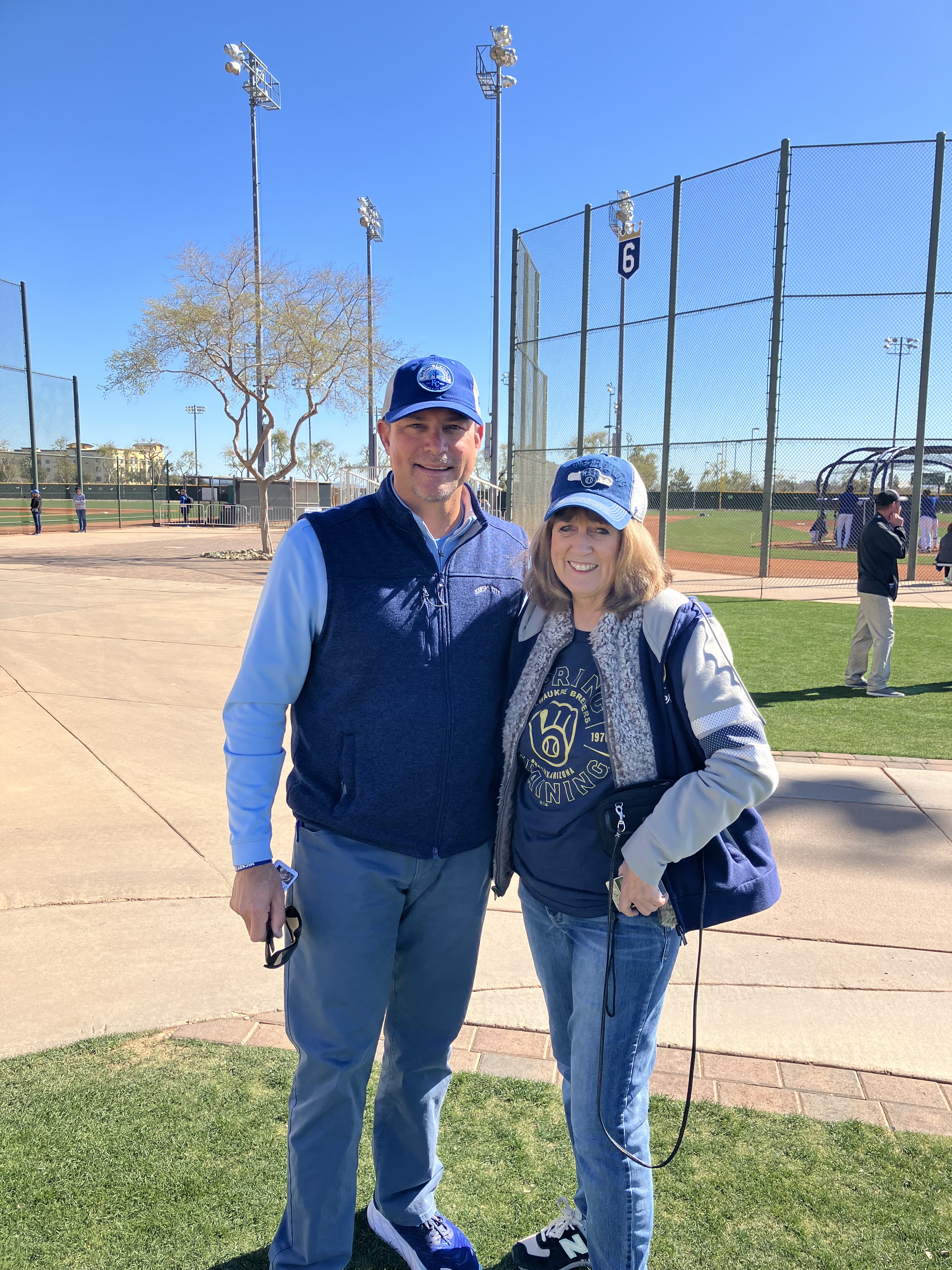 It was a return to Spring Training in March when the weather was supposed to be nicer. Minor leaguers were vying for promotions and most importantly, a celebration of our friend Michele Vassalotti’s performance in the World Baseball Classic was in the making. By taking a flight at oh-dark-thirty and thanks to gaining three hours on a time change, we were at the Brewers complex by mid-morning. Skies were very overcast and according to my weather app, rain was in the forecast. We peeked into the batting cages, then watched players at the practice fields stretching. We finally spotted a familiar frame briskly walking towards us. It was Vassalotti. “I’m pitching in the big field this morning! Come see me!” and off he sauntered. I looked at my watch. We were good for an hour and a half before we needed to head to Goodyear Park for the afternoon game. Within minutes, we were seated with scouts and some family members watching a closed scrimmage of the Brewers. After Michele’s successful inning, we left.