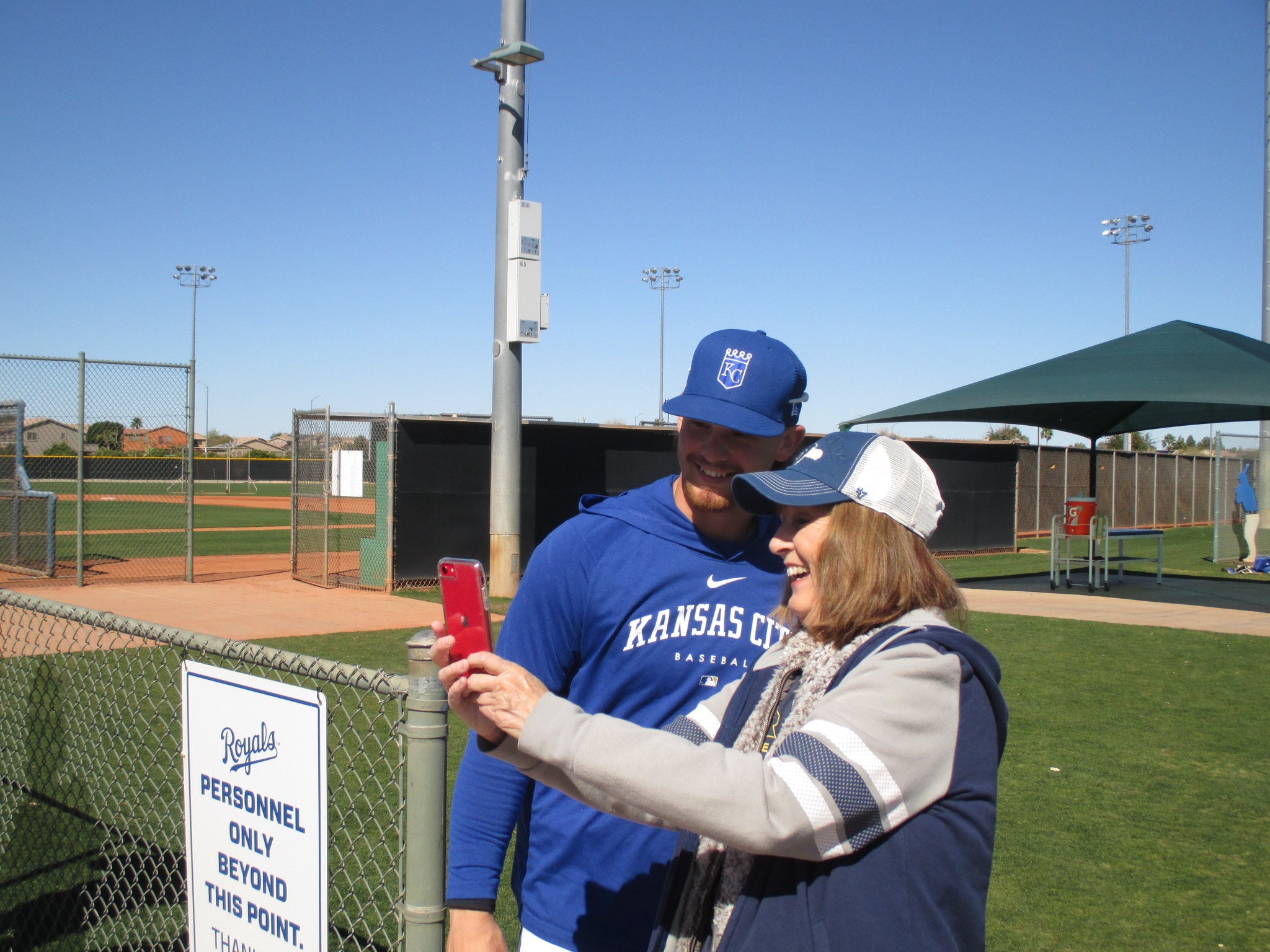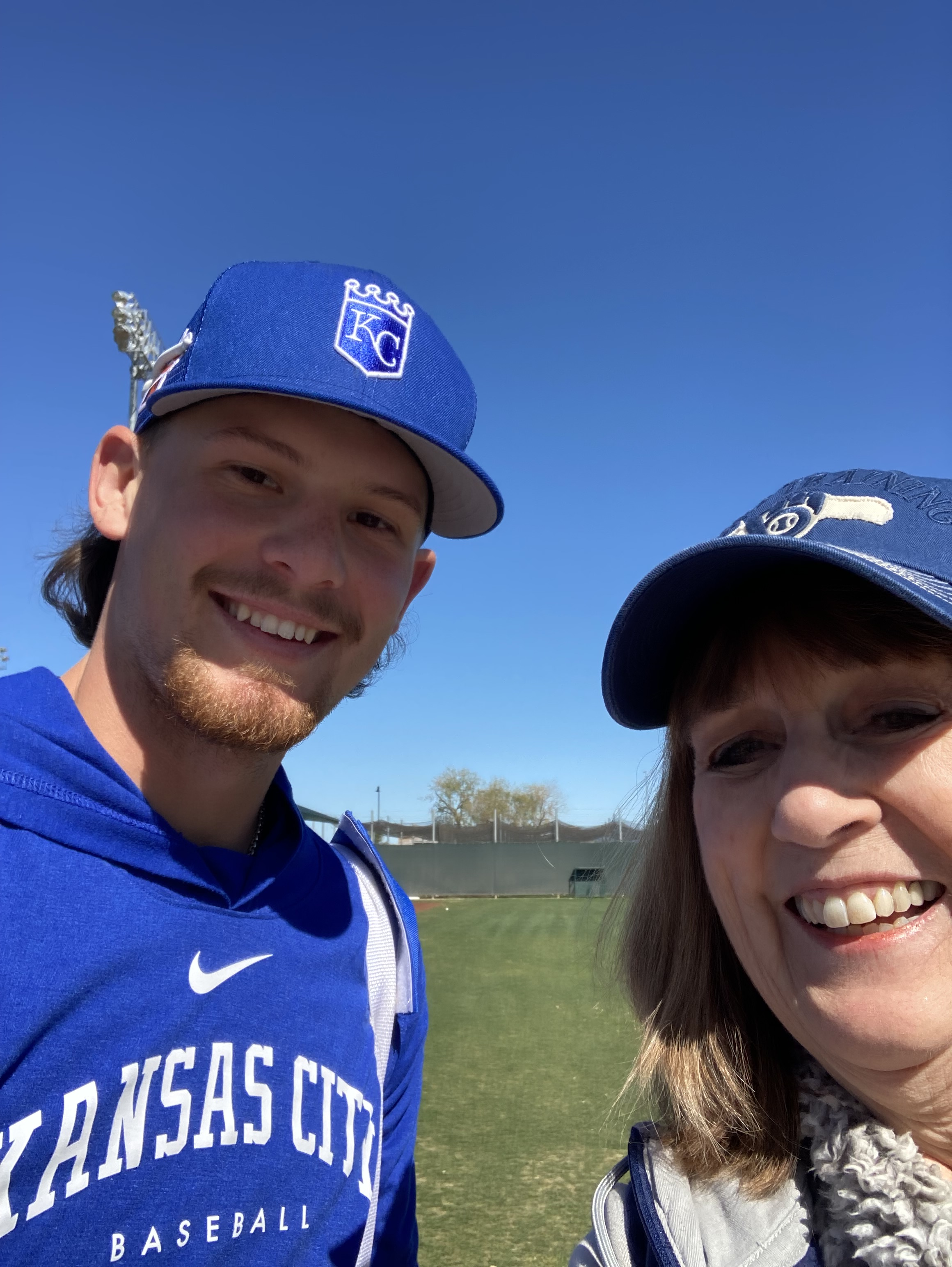 As we watched BP, a group of fans congregated at the fence rail near the gate leading out. At one point, I saw JJ talking to Witt, Jr. After Bobby’s group finished, they proceeded along the fence line. The fans only wanted autographs and pictures of one player – Bobby Witt, Jr.! We patiently waited while he progressed towards the gate out where we were. Finally, he got to us and I quickly explained my connection to his dad. “No, my dad won’t be here until next month.” He kind of chuckled because I guess this was new for him having somebody not want his autograph or picture! “Oh well …” I responded with disappointment in my voice. “Could I please get a picture with you anyway?” so then he really laughed.
