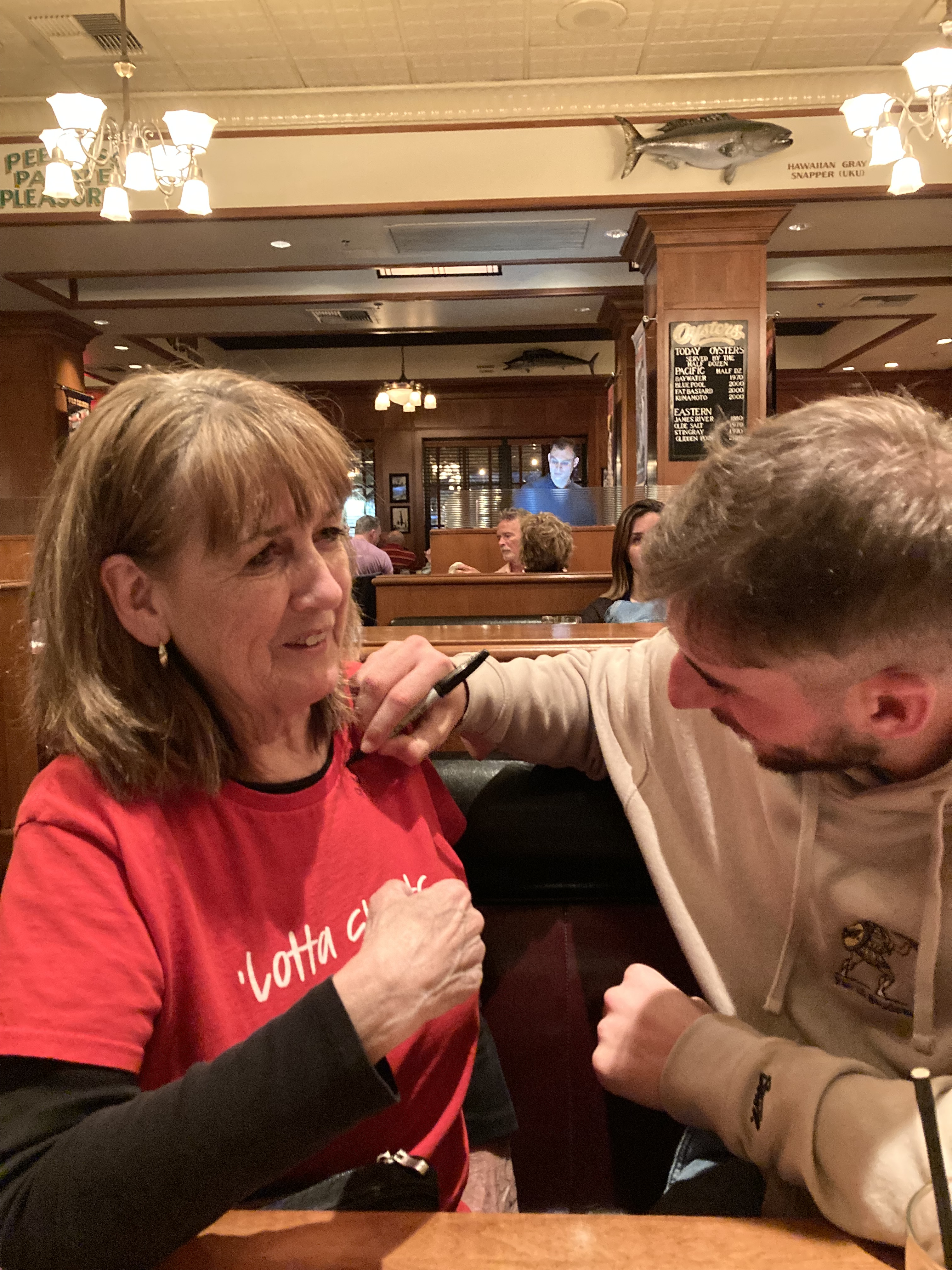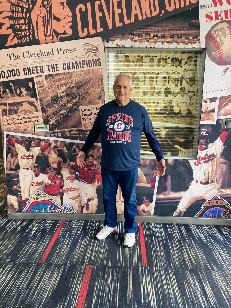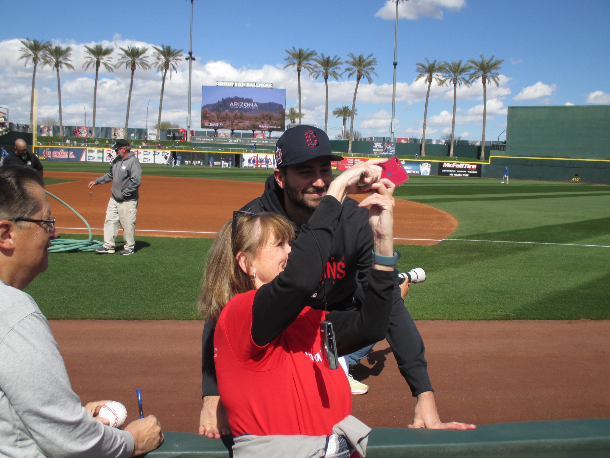 Our final day was the Royals at the Guardians so we were going to see Bobby Witt, Jr again. Rick was decked out in his Indians attire as were many Cleveland fans. We headed over to the practice fields but it was harder to get to see the players since the closest that fans could get was at chain-linked fence at left field. I had to squint to see who was batting. According to Andy and Rick, two older guys that we met, they used to have the practice fields very open to fans but it changed after COVID. We saw Josh Naylor bat and then go over to the right field fence to take pictures with fans. Figures. We were on the wrong side! A little boy next to me belted out, “Stephen Kwan!” The leadoff player headed our way! After the boys got his autograph, I timidly asked for a picture with him and he obliged.