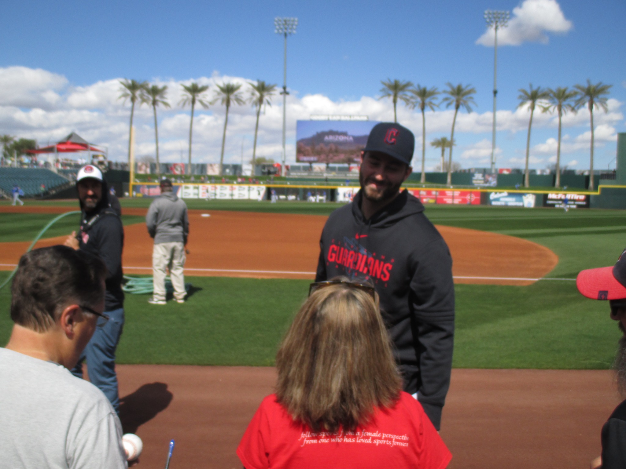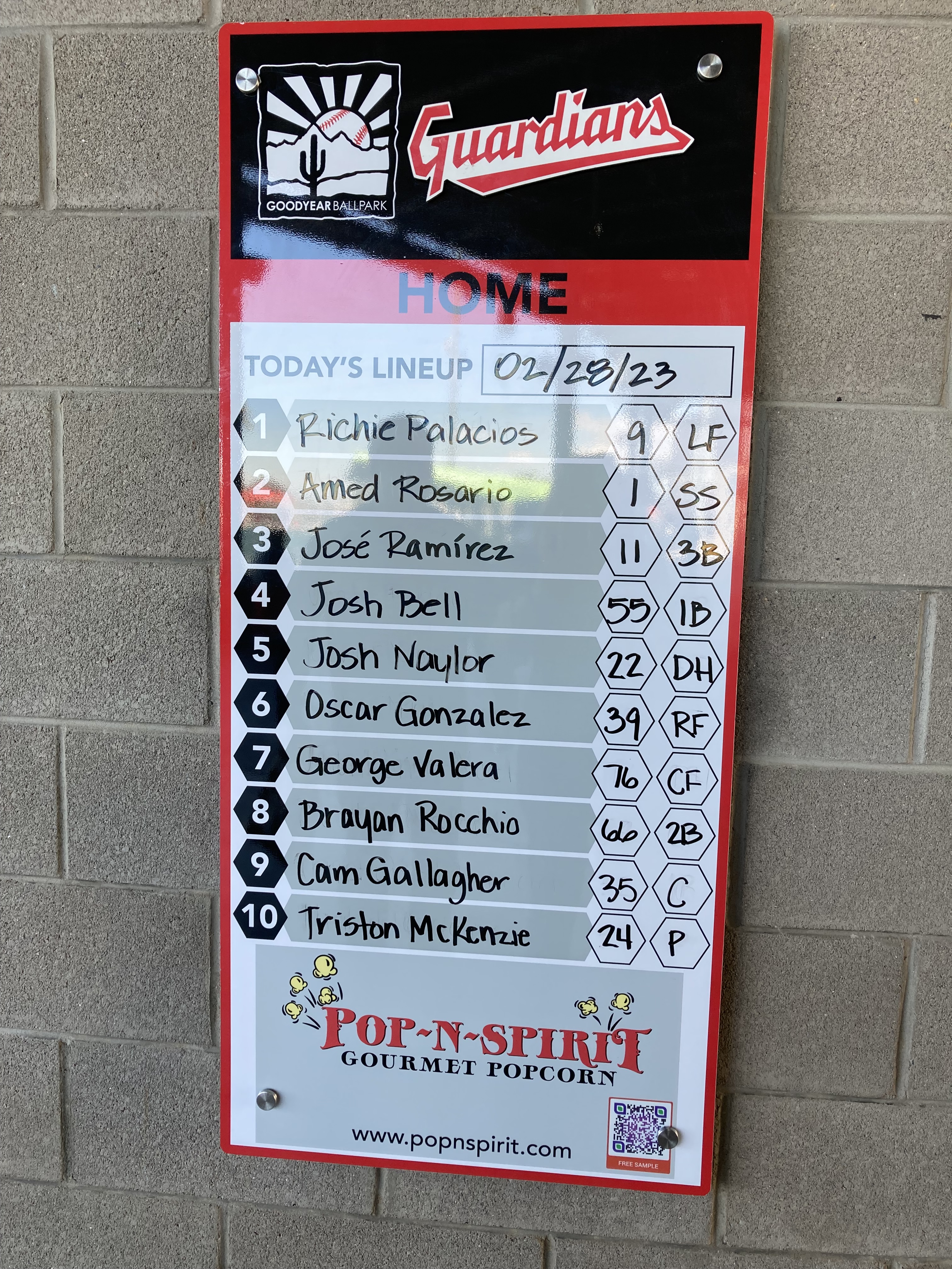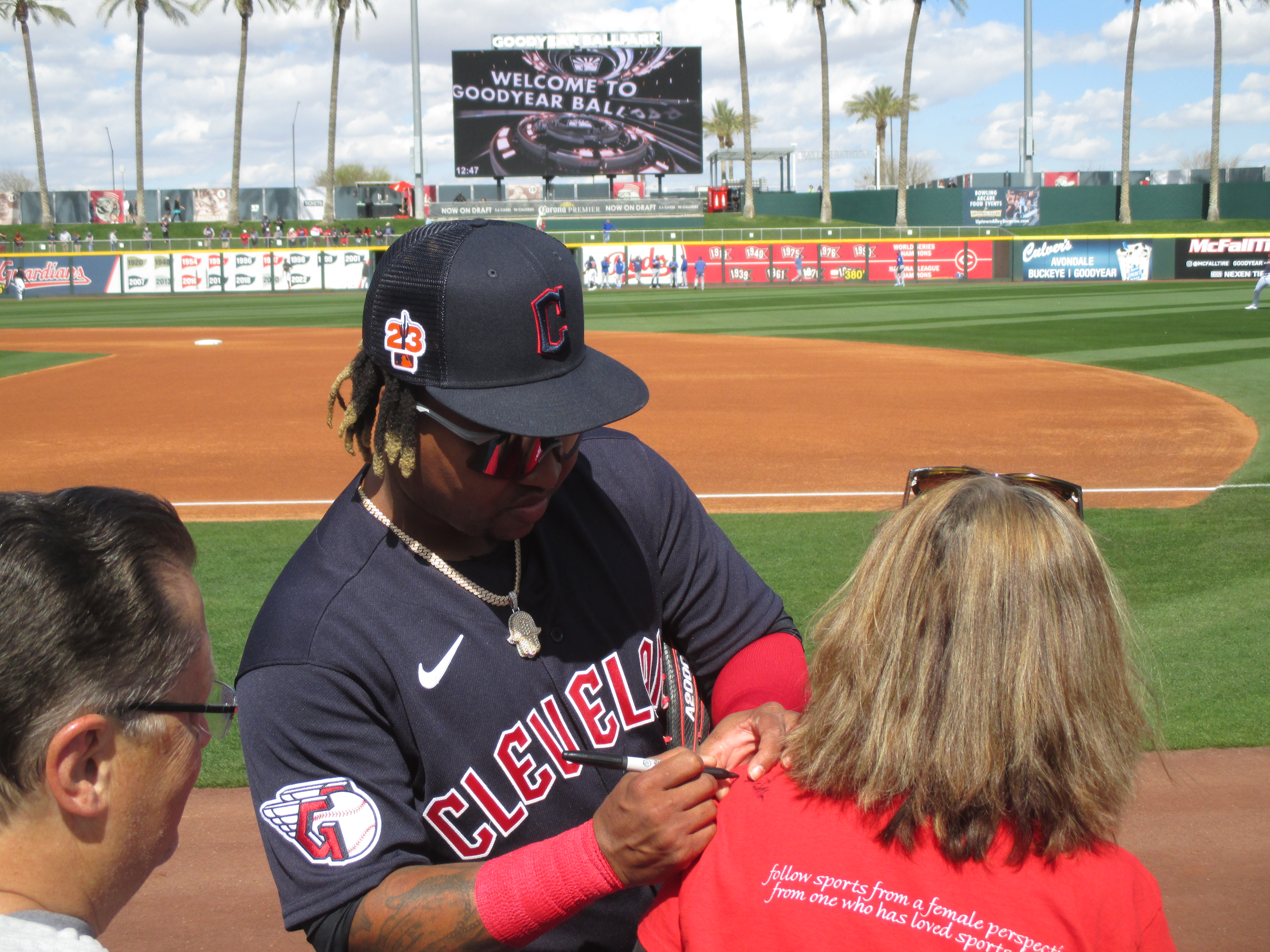 The Goodyear Park was our favorite of the three ballparks. The parking was free and they permitted purses in as well as sealed bottled water. When I was leaving the restroom, our usher was in there and she said, “It will be very sunny in the seats you are in and you’re going to need sunscreen.” I was glad she said something but unfortunately, I didn’t have sunscreen with me. She pointed to a dispenser adjacent to the restroom door. Complimentary sunscreen! I coated my nose with it and headed out. The guys from the practice field, Andy and Rick, were on the concourse on the lookout for us. “We’re going to show you where you can get player pictures and autographs.” The area was the rail between first base and right field. I got my picture made and my Lotta Sports T-shirt autographed by several players including Jose Ramirez, Josh Naylor, his brother Bo and a few pitchers. I was a kid in a candy store! When Josh Bell came out to warm up, the fans went crazy yelling for his autograph – me included! A guy next to me said, “Forget it. He doesn’t sign.” Well, guess who came over and signed!?! Josh Bell! He was bigger than life! During the game, Cleveland’s David Fry was brought in to pitch hit. A voice boomed from a few rows behind us, “Hit it to Colleyville!” That’s where Fry was from and also home of Bobby Witt, Jr. as well as a town away from where we lived in Grapevine, Texas. Unfortunately, the former Indians players were scalped in their game getting beat 12 – 6 by the Royals.