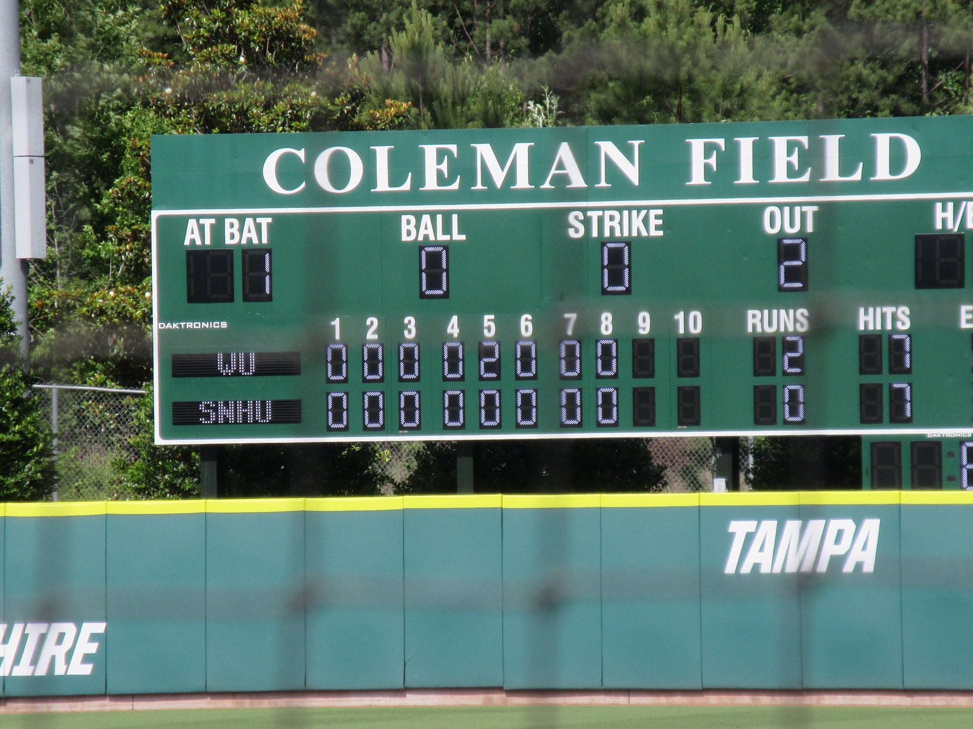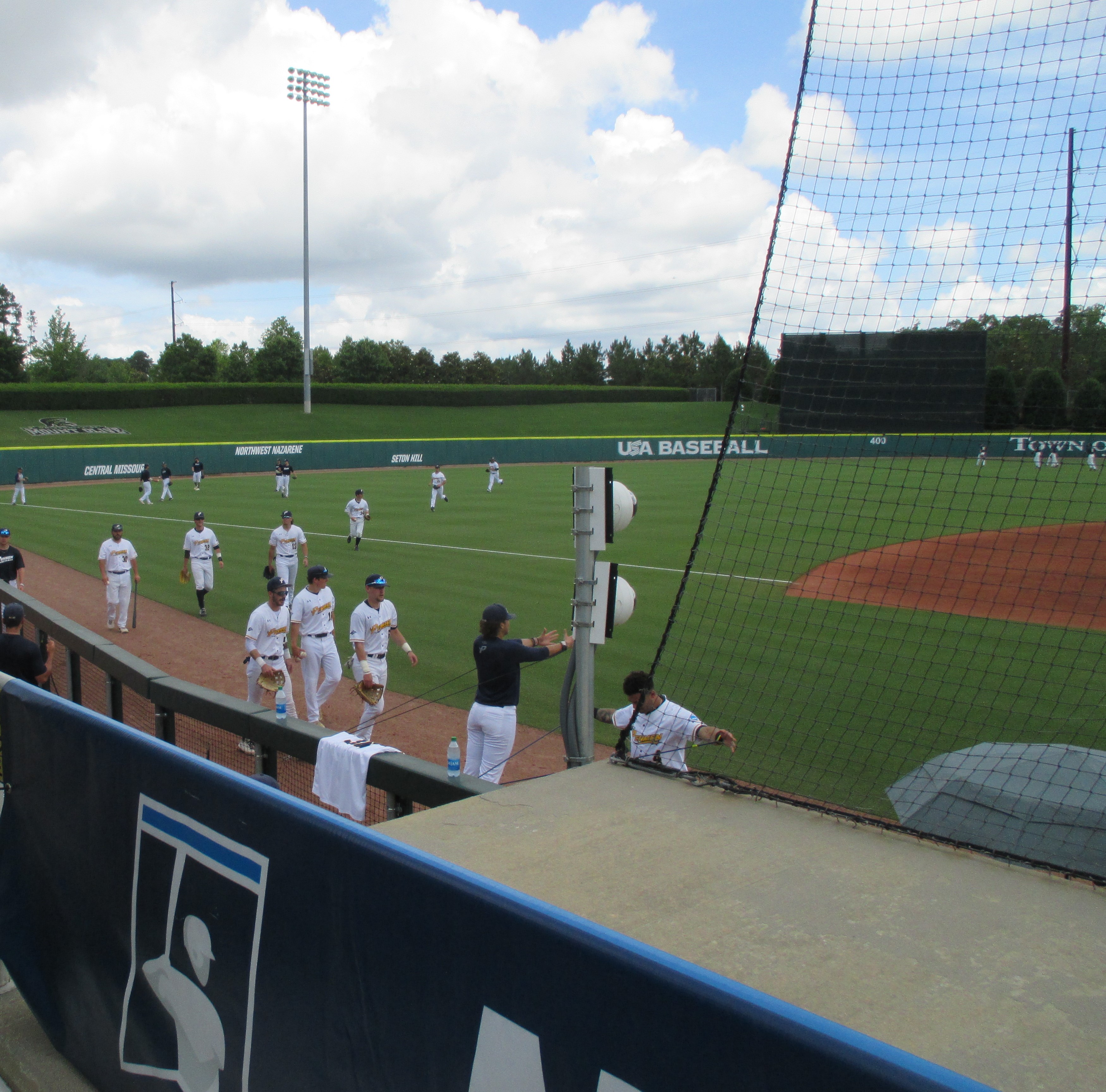 It turned into a long day between my job for the minor league team (only when you have something going on later, do they go on long inning sprees and a delay for bench clearing!) and going to Southern New Hampshire’s game. I battled two heavy rain showers between the two ballparks. When I got to Cary, the weather was gorgeous, but the first game with Angelo State and Wingate was running late due a weather delay. The game ended at 6:45PM (forty-five mins after the scheduled start of Southern New Hampshire and second-seeded Seton Hill game). They rescheduled the second game to an 8PM start. The teams were already there resting on a grassy hill so I’m not sure why the much later start.