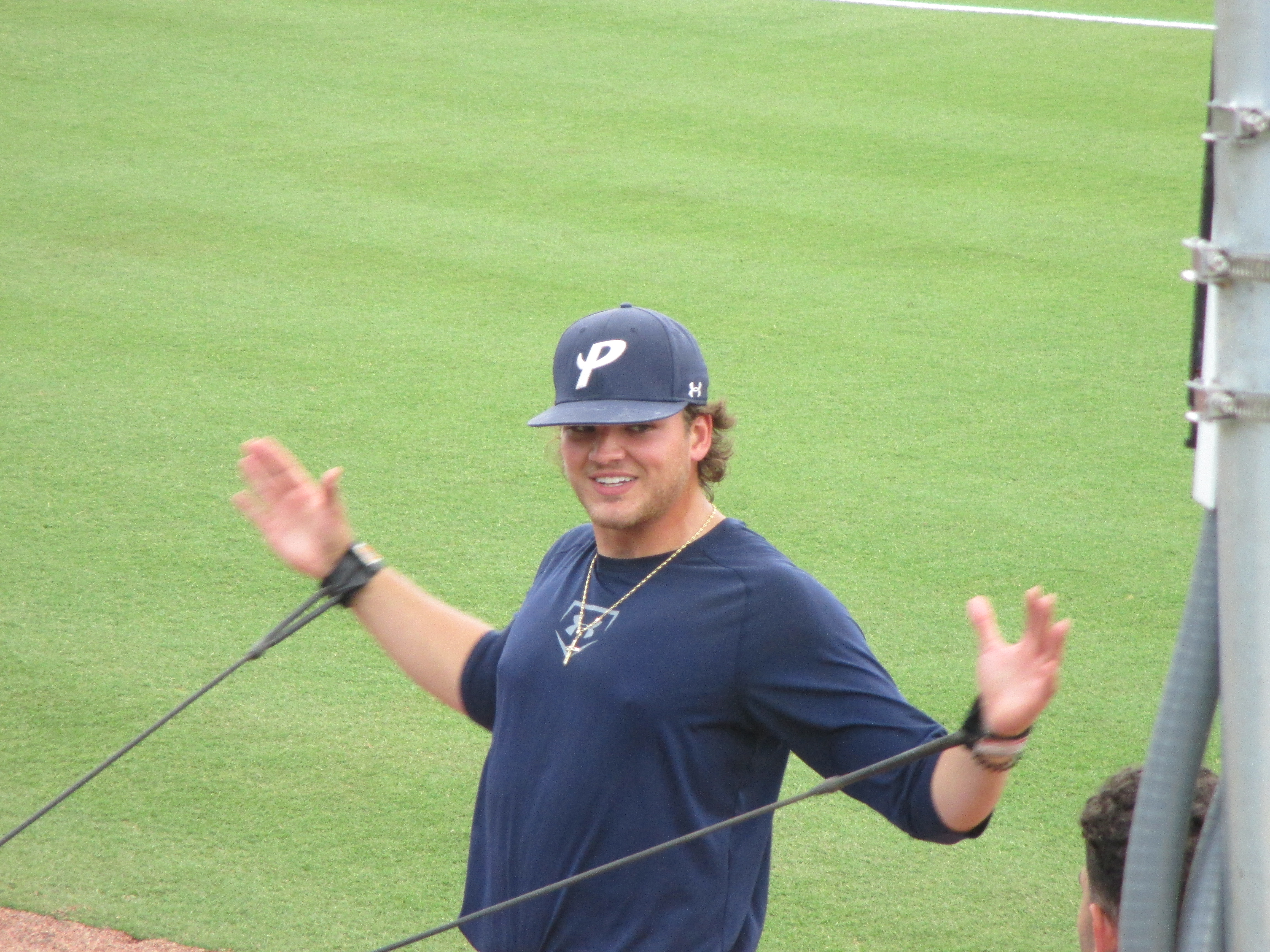 I was initially told at the field that SNH would be on visitors’ side and their dugout would be on 3rd base side. It was a perfect location as I had a seat right over the dugout and adjacent to the bullpen so I knew I would be able to yell to Alex. They ended up on the 1st base side so I moved over. Unfortunately, on that side, the bleachers above the dugout were roped off except to coaches for the other teams who were there scouting and inactive players. I was able to get word to him through the first base coach so he did wave my direction from the dugout.