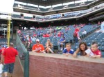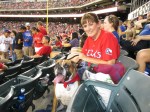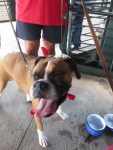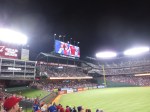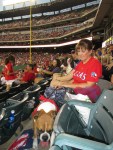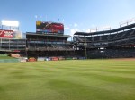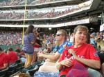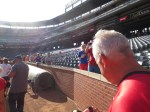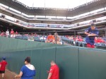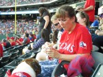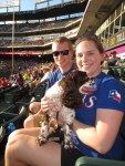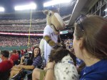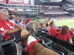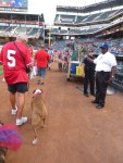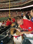 Again, a hike back to an impatiently waiting Roxie and Rex. Once at our seats in left field, I was immediately pleased when I spotted Rex’s favorite hot dog vendor working our section. (Last year Rex howled as the guy ignored his request for a wiener. The vendor had chanted, “Ain’t no dogs for you, bud!” Ironically, Rick’s nickname for Rex is “Bud.) This year was another story — it was too hot to bark for the team, much less a hot dog. It was better to just lay on the pavement panting and save the effort for when the crowd cheered. In the bottom of the first, the Rangers struck fast with two runs including a Mitch Moreland RBI. The second inning, we were again on our feet when a homerun was hit just a few feet away from us. It sure got all of our attention and had us deciding who would go after the ball and who would protect the dogs should it happen again. There was a cute brown and white Cocker Spaniel named Cooper to the right of us, two Scotties behind us and a huge Weimaraner a row in front of us that sat in the chair most of the time when he wasn’t rubbing noses with Roxie. We left after the 7th inning stretch with the game tied 5 – 5. By the time we got to the car, the Rangers had erupted with three more runs.