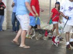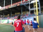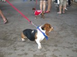 There is no fun more than taking man’s best friend to a ballgame. Roxie and Rex could sense that event was nearing days before the game as they watched me pack Rex’s Rangers bandana, Roxie’s red and blue tutu, traveling bowls, treats and a soft, fleece blanket. Unlike last year’s forty-one degree May freeze fest, this year’s June event was in the nineties! Did that keep the dogs from wanting to go? No… All seven hundred and seventy mutts of all sizes and breeds lined the 3rd base building side for ticket pick-up, and then proceeded to the ramp area to “chill” for about thirty minutes. Soon it was time to start the trek through the bowels of the stadium. For Rex, who was alternating his nose between the ground and air, something was missing this year. No hot dog smell — just a lot of human and dog sweat. Meanwhile Roxie was thankful I had nixed the blue T-shirt for her; the layers of blue and red netting were quite enough of a fashion statement. Finally we reached the huge left-field door and both our dogs wagged their tails and yapped. They knew! Showtime! About a quarter of the way into our walk on the perimeter, a Rangers representative pulled us aside and asked if Rex would mind wearing the doggie cam. Rex was all ears as he explained the pup would be filming the walk for the Rangers Insider. (Keep in mind — this is the same dog that got spooked by a moving pod last November!) How could we say no and let the dog down?!? Rex stood stoic as a stature while the cam was strapped on and we couldn’t help but laugh as he looked so official when he started his gait. At one point in the walk Roxie turned around and placed a big slobbery lick on the camera! The remaining stroll around the field was uneventful (unlike last year’s with someone’s dog getting loose and pooping in center field!). I guess it was just too hot for getting in trouble.