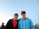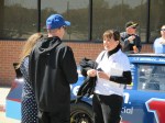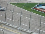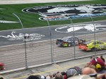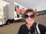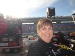 We headed next to the Sprint Cup garage where inspections had started. Surprisingly, many of the crew chiefs and crews were approachable. I had my picture taken with Jason Ratcliff and several of the cars waiting for inspection. One thing I discovered was that the headlamps and taillights were actually decals instead of the real thing. Multitudes of fans were gathering in the garage area and NASCAR rep Laura Finley was caught in the middle of the crowd control. “Please, if you’re not with the team, stay behind the yellow line.” As I started to step back, she said, “You’re fine.” I thought to myself, “I love this job!” The next hour was spent back at the media center posting pictures and updates on Facebook and Twitter. It was then I found out that Claire had aired my post-race question to Brad the night before on SiriusXM. I was so glad that inquiring about changing shadows and the setting sun on the track wasn’t such a dumb question after all! It was soon race time so it was back out to the track for pre-race ceremonies. Rick positioned himself at the photographers’ well at Turn 1 while I wandered up and down the pit. During the race, I ventured up to the grandstands to look for Hill Country’s Denise LeMeilleur attending the race.