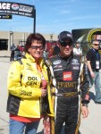 The fun of race weekend is meeting other fans. While watching the cars practice, I chatted with a photographer standing next to me. I detected a Midwest accent so I asked him where he was from. “Hi… Larry…east side of Cleveland, “ he replied as he extended his free hand. I laughed and pointed at my husband. “Meet Rick….west side of Cleveland. They proceeded to talk Buckeyes and Browns football with Larry photographing the cars at the same time. There also was an “older” red-head who I spotted chasing down a golf cart containing Carl Edwards. Upon meeting her the following day, I found that Shirley was just as avid a motorsports fan as me. She was thrilled when I told her I had captured a pic of her with Edwards. My favorite fan was a little boy named Landon. I asked him who his driver was. “My uncle,” he replied. The uncle turned out to be Nationwide driver Jamie Dick who came over and gave him a hug. Since the race was during football season, there was a mix of fans wearing their favorite team or player jersey. Although, Jerry Jones claims to own “America’s team,” Cowboy fans were outnumbered by the Saints, Broncos, Texans, Bears, Packers and Steelers in the apparel wearing department. Those most fun to view were the couples who wore different NASCAR drivers apparel. Interesting combinations made for jabbing at their spouses in the stands. Although Rick and I are miles apart on football teams, we do like the same drivers.