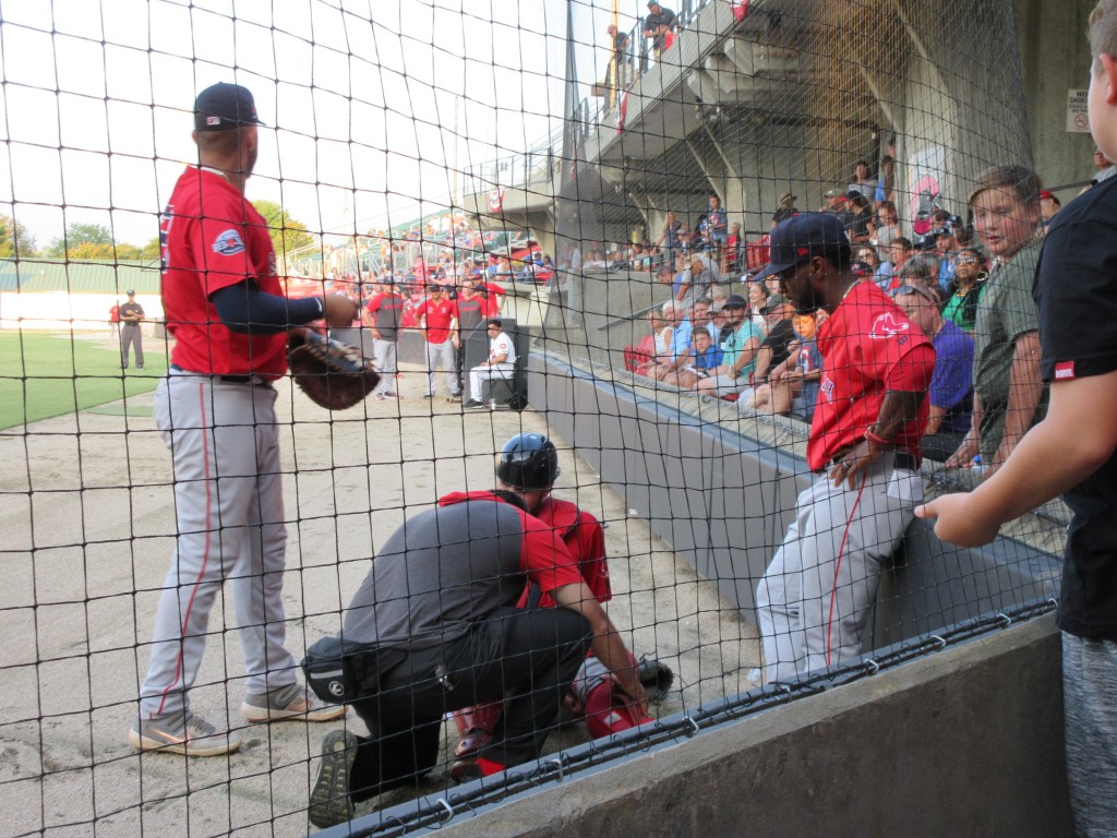 Game 1 los Pescados de Carolina (Carolina Mudcats) (it was Hispanic theme night) rallied to defeat the Salem Red Sox 6-4. The Salem Manager and a pitcher were ejected after the pitcher hit a Mudcats player. Game 2 ‘s pre-game, I had noticed fans gathered at the right field corner gate greeting players coming from the clubhouse into right field for warmups. I joined them and spotted one of the players I had talked to Game 1. I yelled to him that I had called his 7th inning home-run the night before. “Really? Why didn’t you do it sooner?” We both laughed.