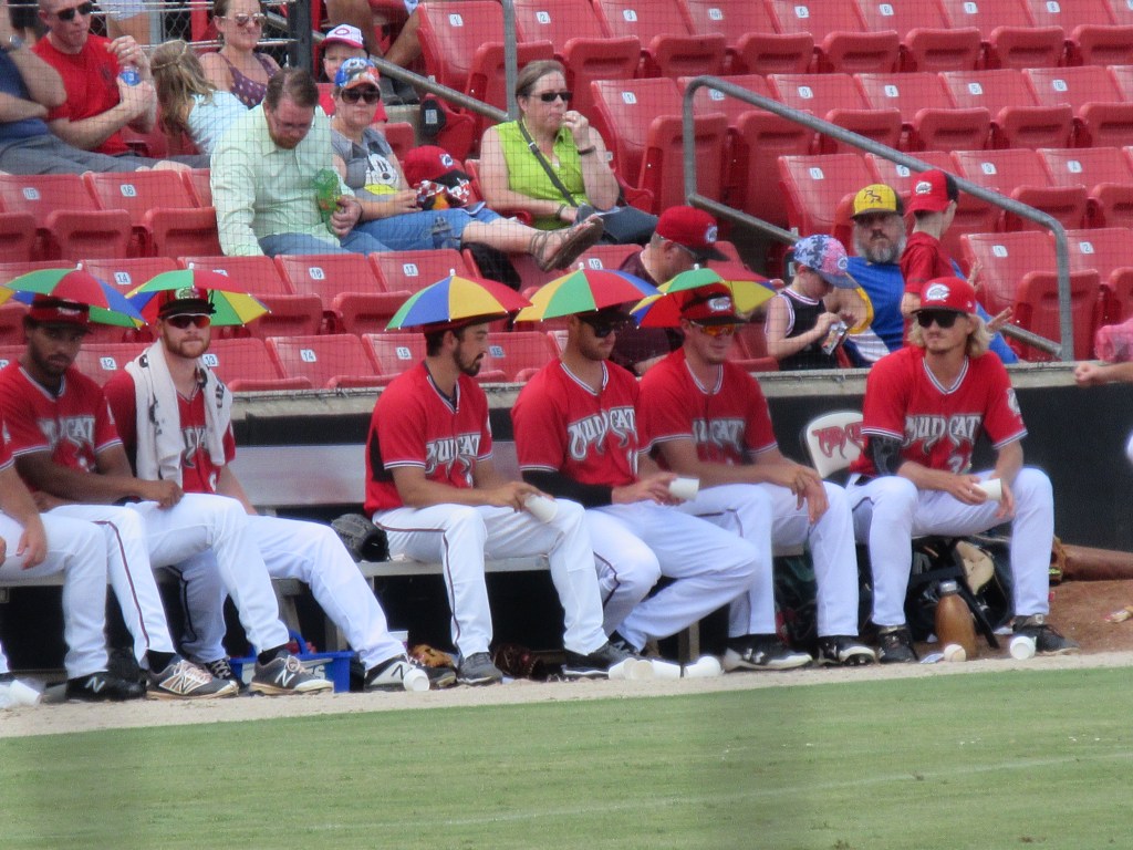 It was a nice country drive over to Zebulon with the worst of the traffic leaving our town. Suddenly I spotted a huge baseball tower on the horizon. The parking attendant acknowledged Rick’s handicapped placard and directed us to parking closer to the stadium. Families were milling near the gate; kids with their gloves hoping to take home a souvenir fly ball. Our tickets were affordable and our seats were fantastic – front row next to the visiting dugout at the end where the players came out of the dugout to the on-deck circle. We could see the players waiting and lineup swings as the pitcher threw to the player batting. I smiled at the bat boy intent on his important job and wondered if years from now he would instead be in the on deck circle.