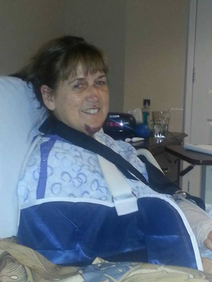 Once at ER, details were sketchy as I drifted in and out of consciousness. I asked Rick to find The Chase on the TV. I remember a voice saying, “I need to cut off your shirt” and heard the snips as the scissors destroying my lucky black ‘Lotta Sports T-Shirt. I was wearing it that day since Matt Kenseth, my driver of choice, had won several races when I wore it. At one point Rick said, “Matt’s in second” and the announcers were talking about Jimmie Johnson much further back. There was hope for an upset! I was whisked away to X-ray. I am screaming in pain as X-ray technician positioned both arms. What part of broken did the radiologist not understand? Following this fiasco it was back to ER. A voice said they were starting morphine. I begged them not to as my mom died at that same hospital after having morphine administered. I drifted off and on. “We need to move you to another hospital in Plano. “ “That’s so far for Rick! Can’t I go to Grapevine or Southlake?” “It’s a sister facility.” I looked up at the TV and Jimmie is celebrating a sixth Chase Championship. More sleep until I was awakened by people repositioning me to a board and gurney. It was dark as they loaded me in an ambulance. Another long ride but this time, it was all highway. I missed Sunday Night Football. I awoke the next morning. A doctor was standing at my bedside and said that they were waiting on parts for my elbow. The surgery wouldn’t be until the next day. More sleep. I woke up and Rick updated me. They had located the elbow parts. The left elbow was shattered, the right shoulder was broken, I had stitches in my chin and three fractures in my jaw. Surgery was scheduled for three that afternoon.